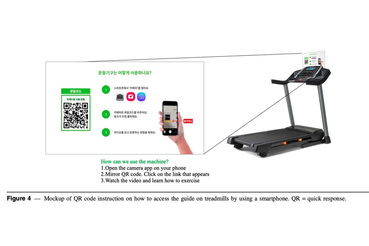 또한 QR 코드를 활용해 각 운동기구에서 스마트폰으로 가이드에 쉽게 접근할 수 있도록 합니다. 카메라 앱을 열고, QR 코드를 스캔하고, 링크를 탭해 비디오를 보는 3단계 안내가 쉬운 읽기 형식으로 제공됩니다.